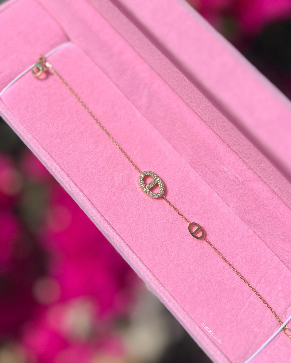Un bracelet fin et moderne au design iconique, orné d’un maillon ovale pavé de zircons. Minimaliste, féminin, et parfait pour sublimer tous les looks.